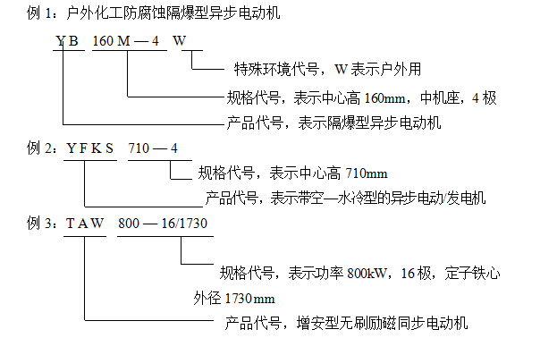 2.5 特点代号系表征电机的性能、结构或用途而采用的汉语拼音字母,对于防爆电机类型的字母A(增安型)、B(隔爆型)、W(无火花型)应标于电机特点代号首位,即紧接在电机类型代号后面标注。