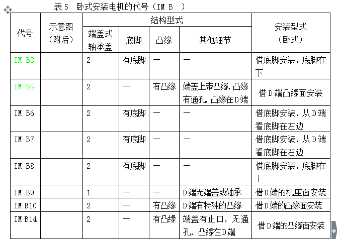 卧式安装南阳防爆电机的代号由字母IM(国际安装)空一格,随后为字母B和1位或2位数字组成,见表5。