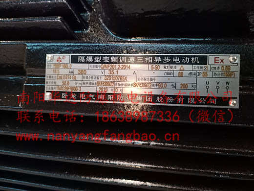功率:18.5kW 电压:380V 额定电流:35.1A 转速范围:300-3000rpm 噪声:88dB(A) 防护等级:IP55 热分级:155(F) 防爆等级:ExdIIBT4 Gb 轴承型号:SKF6309 效率:90.9% 重量:200kg